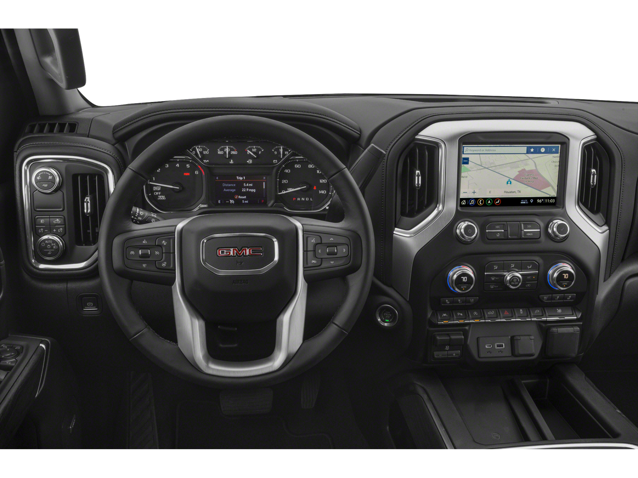 Inside, the SLT cabin feels premium without losing its work ethic. Heated and ventilated front seats, heated second-row outboard seats, a heated steering wheel, power seats with memory, and leather-appointed touches create a truck that knows how to treat its driver right. The power sliding rear window, floor-mounted console, universal home remote, and remote starter system make it easy to live with every day.